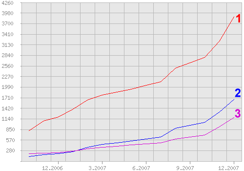 Главный и неизменный результат нашего опроса заключался в том, что, начиная с октября 2006 года по настоящее время по итогам каждого месяца первое место занимал Дмитрий Медведев, ни разу не дав повода хотя бы усомниться в своём превосходстве. В подтверждение этих слов приведем график динамики рейтингов первой тройки с октября 2006 по декабрь 2007 года.
