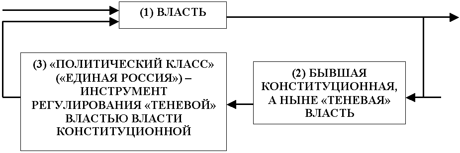 Принципиально не стану оценивать законность и моральность подобных политических преобразований, а уж тем более - их целесообразность с точки зрения интересов Государства. В конце-концов, несколько оттащить страну от пропасти, у которой она пребывала в конце 90-х, В.Путину и его команде удалось, возможно, как раз благодаря сосредоточению управления всеми ветвями власти в одних руках. Однако классическая схема управления, с которой мы начали, при этом претерпела существенные изменения. Так называемый "политический класс", которому согласно идеализированной демократической схеме отводилась роль "народного регулятора Власти", сам оказался вписанным в систему Власти как её функциональный элемент, лишь отрабатывающий в виде принятых законов исходящие указания.