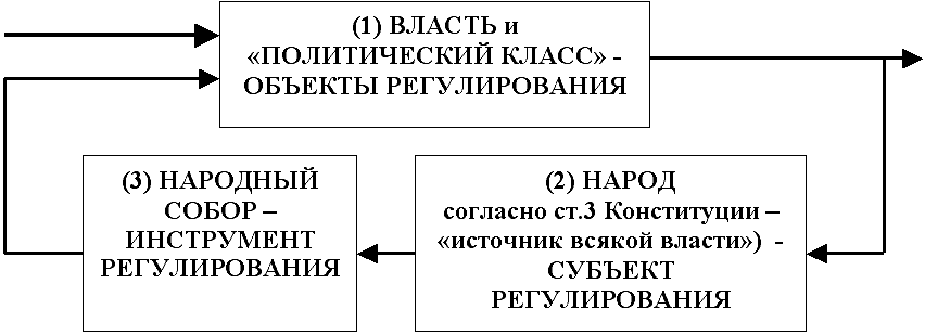 Значит, чтобы осуществлять эту регулирующую функцию, Народу необходим ИНСТРУМЕНТ - некий представительный орган (собрание народных представителей, или современный аналог принимавших важнейшие стратегические решения Земских Соборов), полномочный сформулировать подлинную волю Народа по этим вопросам. Т.е. задать для Власти чёткие и обязательные рамки, в которых она обязана будет действовать, причём вне зависимости от того, кто завтра будет президентом и какая партия победит на выборах. Курс и "правила игры" должны оставаться неизменными в любом случае, а специально уполномоченные постоянно действующие структуры Собора проследят, чтобы они действующей Властью не нарушались. Мы называем эту структуру, которую совершенно необходимо ввести в политическую систему, "Народным Собором", но в принципе, название может быть любым - важна суть.