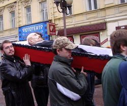 19 октября на Старом Арбате прошла публичная акция молодежного крыла партии "НОВЫЕ ПРАВЫЕ" по символическому захоронению тела В.И. Ленина. Акция проводилась накануне Дня народного единения, впервые отмечаемого в этом году 4 ноября, и была призвана положить конец гражданской войне, продолжающейся в умах граждан России уже почти 90 лет. По мнению лидера молодежного крыла "Новых Правых" Александра Ермакова: "Место Ленина в истории уже определено - мавзолей должен стать музеем, а тело пора предать земле".