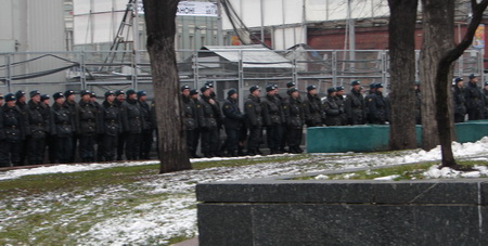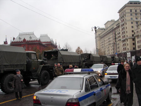 Вообще, силовиков нагнали тьму: на улицах и площадях с утра до вечера стояли многочисленные кордоны внутренних войск за железными решетками, перекрыты были и подземные переходы - так, что даже простым "мирным гражданам" и иностранным туристам не было проходу. Собравшись уже на наш митинг на площади Революции, мы стали свидетелями комичной демонстрации силы "нашим" любимым государством. Несколько сотен коммунистов и их сторонников настолько ужасают власть имущих, что нужно было пригнать к месту митинга целую колонну тяжелых армейских грузовиков с солдатами, ОМОНовских грузовиков, поставить их автобус прямо на площади, понатыкать всюду кучу заграждений с металлоискателями. Пригнали даже толпу мэрских "дружинников", решивших верой и правдой охранять спокойствие олигархов, не работая в милиции. Толпе солдат и милиционеров пришлось стоять там целый день только затем, чтоб жирные чинуши, обирающие каждый день и их, и нас, могли сидеть беспечно в своих кабинетах, надеясь в случае чего раздавить народ напором грузовиков и дубинок…