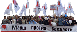 Бедность давно уже стала нашим пороком нашего государства. Страна разделилась на две неравные части – сверхбогатых господ и бедствующих «простых россиян». Иногда приходится слышать успокаивающие заверения политиков о том, что нищета большей части россиян – это неизбежное следствие переходного периода. Но сколько еще лет может длиться этот самый «период»? Главным вопросом сегодня стало не «кто виноват», а «что делать». Проблема бедности – общая для всей страны. Но у каждого российского региона есть свои «болевые точки». На Камчатке и Сахалине волнуются рыбаки, в Ростовской области недовольны уровнем жизни шахтеры, в Иваново – ткачихи. И все они в ходе марша предъявят свои веские претензии к местному руководству. Страну объединят лозунги: «Россиянам – достойную жизнь!», «Заставим чиновников работать!», «Нищий народ – позор власти!», «Поднять зарплаты бюджетников и пенсии в два раза!»