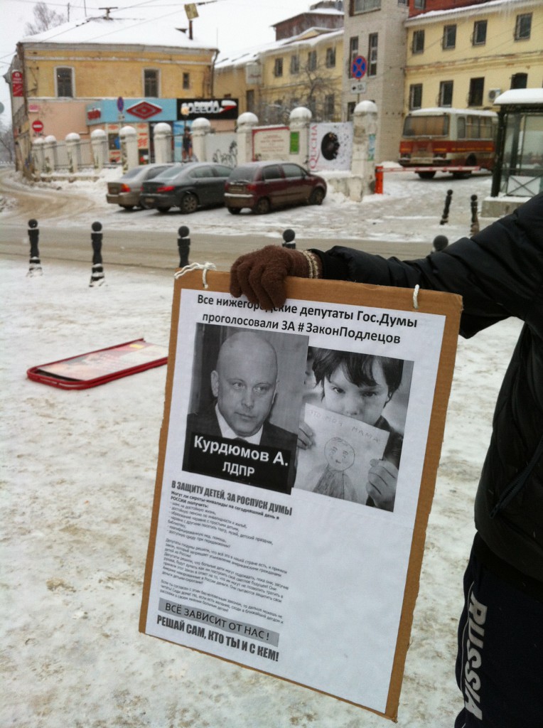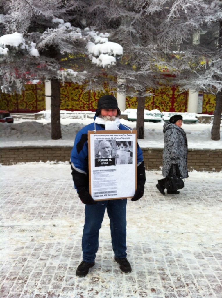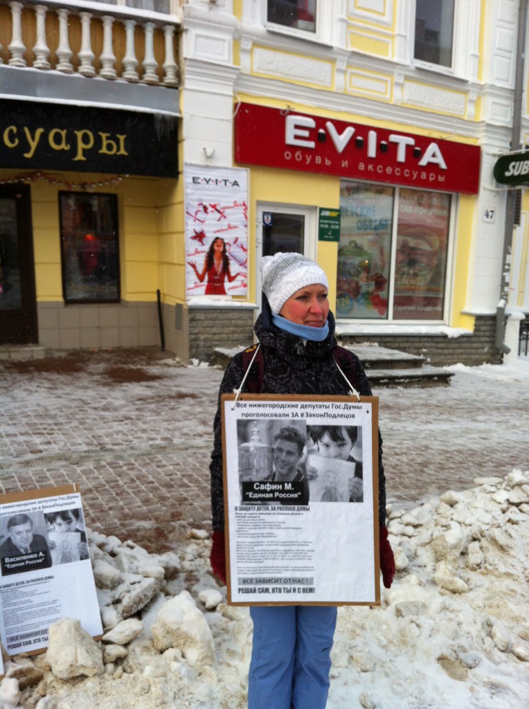 В воскресенье, 13 января, Москве прошел — за отмену «антисиротского» закона Димы Яковлева, запрещающего усыновление российских детей-сирот американцами, и за роспуск принявшей его Госдумы. В Нижнем Новгороде в знак солидарности с массовой столичной акцией прошли одиночные пикеты общественных активистов в защиту детей и за роспуск Госдумы. Пикетчики, среди которых были и члены нижегородского регионального отделения РПР-ПАРНАС, стояли вдоль всей пешеходной части улицы Большая Покровская. У каждого был плакат с портретом одного из 10 депутатов Госдумы и 2 членов Совета федерации от Нижегородской области, которые «в едином порыве» проголосовали «За» «антисиротский» закон Подлецов. Напомним их имена – нижегородцы должны знать своих «героев»: