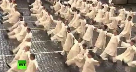 В итоге этот День смотрелся как-то совсем уж абсурдистски - так, как будто фильм типа "Дня Выборов" предложили снять Андрею Тарковскому. Меня больше всего потрясло дефиле "военных оркестров" по заливаемой беспощадным дождем пустой и безлюдной Тверской. Несчастные оркестранты, с целлофановыми пакетами на головах поверх фуражек, все как один в серых дождевиках поверх кителей медленно и печально маршировали вниз по улице. Барабанщики били в мокрые барабаны, трубачи с натугой дудели в насквозь мокрые трубы. Больше всего это было похоже на парад зомби. Говорят, только оркестр Бельгии в последний момент отказался участвовать в этом безумии, все остальные - оркестры Белоруссии, Китая, Пакистана и Казахстана - честно прошлепали весь путь по бывшей Gorky Street до конца.