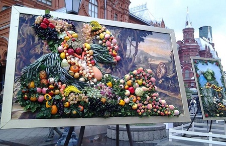 "День города на Красной площади. Не к ночи будь показано. Что за зловещий кладбищенский фон с совами? А муляжи фруктового изобилия что означают? Памятник плодам, погибшим под бульдозером?"