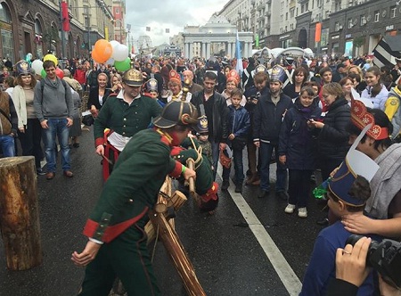 "В ходе празднования Дня города на Тверской разыграли театрализованную сценку казни национал-предателя. Люди в костюмах XIX века скрутили, связали веревками и потащили сквозь толпу к плахе с топором человека, тоже актера, приговаривая: