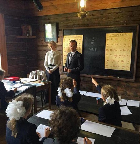 Здесь прекрасно совершенно всё - изба, доска, парты, учительница в наряде начала ХХ века, аки голубка покорно склонившая голову, икона в углу, модернизированная керосинка под потолком, мудрый приветливый правитель.