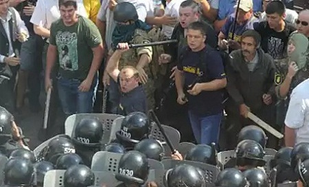 Снова началось месиво по центру. По краям - все те же тетушки с иконами, а из-за их спин полудурки тычут в бойцов флагштоками.