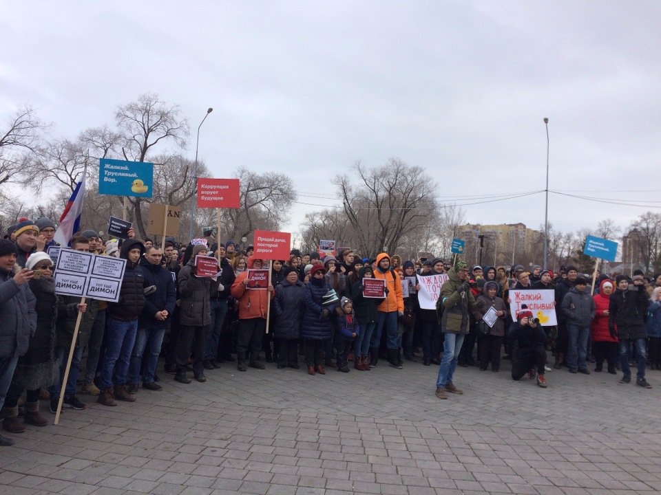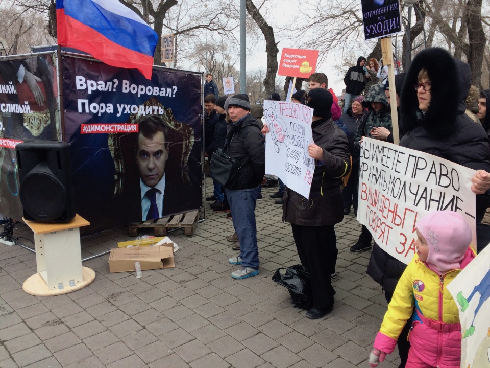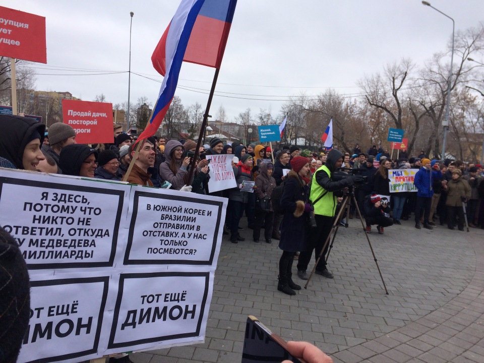"Жалкий трусливый вор", "Мы против коррупции", "Премьера к ответу", "Денег нет, но не у Димона", "У Димы в бокале вино искрится", а для народа денег нет, велено крепиться", "наш Димон большой едросс, весь в коррупции зарос" и другие. Организаторы в начале митинга объявили о конкурсе на лучший плакат.