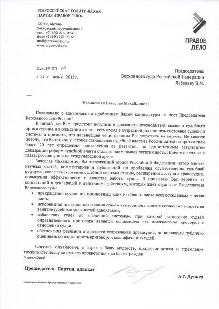 Председатель партии «ПРАВОЕ ДЕЛО» Андрей Дунаев направил поздравление Вячеславу Лебедеву, чья кандидатура на пост Председателя Верховного суда была единогласно одобрена высшей квалификационной коллегией.