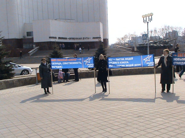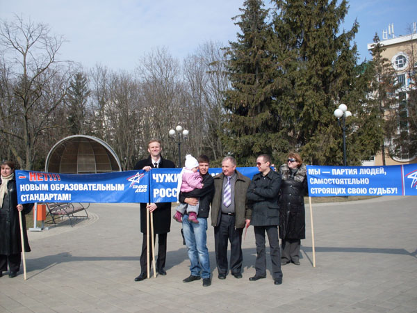 Основные лозунги пикета: «Нет новым стандартам образования», «Чужим умом Россию не поднять», «Преуспевающий учитель - преуспевающая страна», «Учитель должен стать обеспеченным человеком», «Наш главный лозунг – свобода, собственность, порядок», «Мы – партия людей среднего класса, мы – партия людей дела», «Мы – партия людей, самостоятельно строящих свою судьбу».