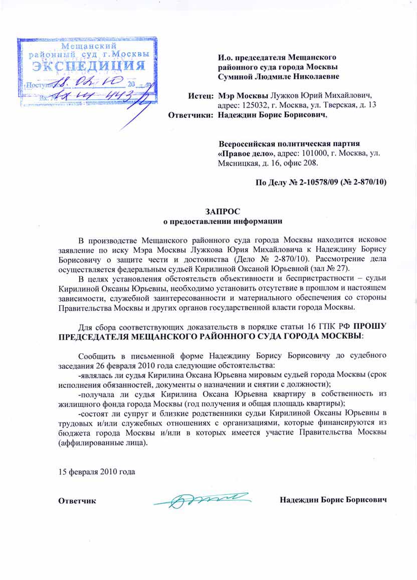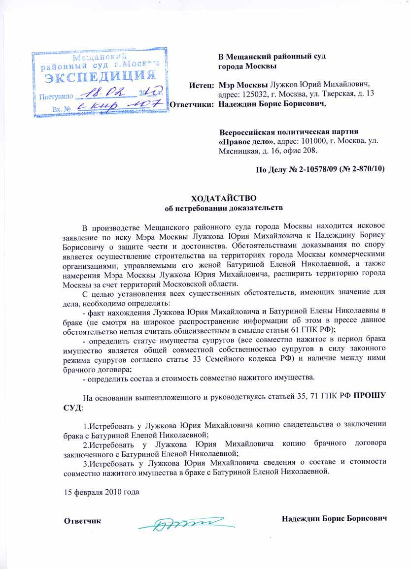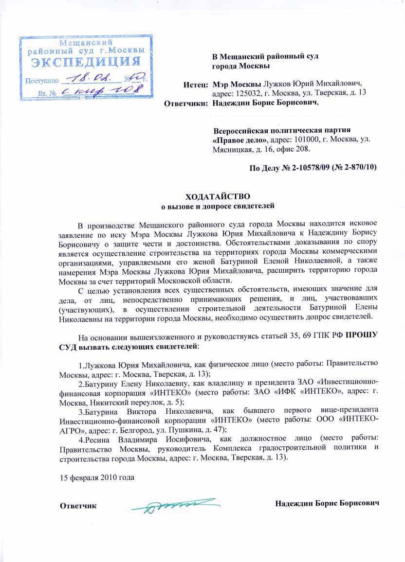 Борис Надеждин подал ходатайства на процессе по иску Лужкова