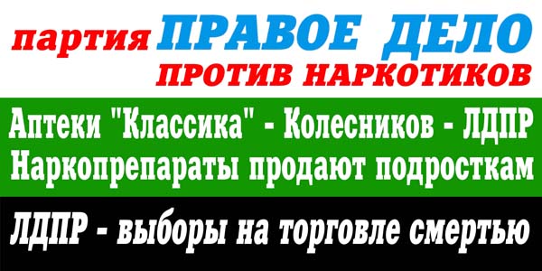 - Мы столкнулись с новыми, изощренными способами легализации наркотических средств, - говорит активист челябинского «Правого дела» Александр Воложанин. - То есть одной рукой мы боремся с распространением наркомании, другой легализуем наркотики. К чему тогда эта борьба? Колесников, владелец сети аптек «Классика», где проводили съемку наши активисты, - кандидат от ЛДПР на предстоящих выборах. Получается, что эта предвыборная кампания оплачивается жизнью и здоровьем наших детей.