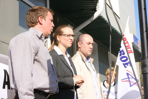 Лидер челябинских правых Алексей Севастьянов, представители отделения Анна Сердюк и Василий Горшков (слева направо) выступили на митинге
