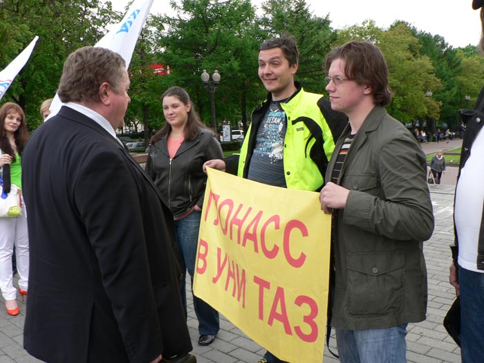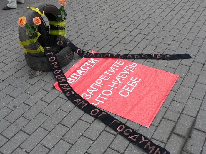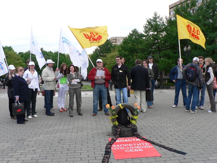 Федерация автовладельцев России (ФАР) при поддержке партии «Правое дело» 20 мая провела в центре Москвы пикет против положений нового технического регламента «О безопасности колесных транспортных средств», а также против повышения таможенных пошлин в связи с рассмотрением в Верховном суде первого иска на соответствующее решение Правительства РФ. В среду вечером в Новопушкинском сквере собралось около 30 человек с символикой ФАР и «Правого дела». Из автопокрышек на площади был сооружен импровизированный венок, на лентах которого была надпись «Автомобилистам России – от правительства и Госдумы». Участники акции держали плакаты с лозунгами: «Уровень жизни поднимите, а не пошлины!» «Власть! Запретите что-нибудь себе!», «Парламент затрахал тех.регламент!» и «ГЛОНАСС – в УНИ ТАЗ!». В пикете принял участие председатель регионального отделения партии «ПРАВОЕ ДЕЛО» Московской области Борис Надеждин.Цель акции – требование к Правительству РФ к соблюдению конституционных прав и свобод автомобилистов при принятии нового техрегламента, пересмотра антикризисной программы Правительства РФ в части поддержки неэффективных и неконкурентоспособных производств и направления финансовых средств на повышение покупательского спроса и поддержки малоимущих граждан.По словам организатора акции Сергея Канаева, новое положение не имеет никакого отношения к безопасности на дорогах. «Это очередной подарок отечественному автопрому. Его конкуренты вынуждены будут уйти с рынка», - считает С.Канаев.