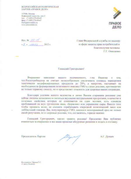 «Благодаря усилиям вашего ведомства и лично Вашим стараниям, россияне уже сейчас лишены возможности питаться вкусными натуральными продуктами, в качестве и полезных свойствах которых, не сомневается ни один человек, хоть однажды пробовавший на вкус грузинские вина, «Боржоми» или украинские сыры», — говорится в обращении лидера правых. Дунаев призвал Геннадия Онищенко не спешить отрабатывать очередной политический заказ или лоббистский гонорар: «Популяризируя ГМО, Вы наносите непоправимый вред не только своей репутации, но и здоровью россиян, что, согласитесь гораздо важнее».