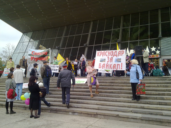 В рамках единой волны акций жители Краснодарского края вышли на улицы краевого центра, чтобы выразить протест против планов по строительству на Утрише физкультурно-оздоровительного комплекса управления делами Президента России, против готовящегося запуска экологически опасного терминала по перевалке минеральных удобрений в городе Туапсе, превращения города Ейска из курортного города в перевалочную базу нефтепродуктов, выразить категорическое несогласие с использованием объекта Всемирного природного наследия - озера Байкал в качестве сливной ямы для Байкальского целлюлозно-бумажного комбината, а также выразить солидарность с защитниками Химкинского леса.