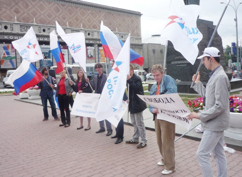 Участники акции, одетые в майки с надписью «Наша страна – наша свобода» держали в руках плакаты с лозунгами «Кризис в головах лечится голосованием», «Свобода. Собственность. Порядок» и «Россия, с праздником!».