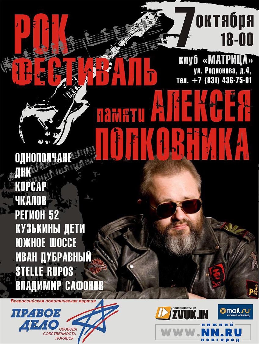 Нижегородская область: 7 сентября в в Нижнем Новгороде в клубе «Матрица» (ул. Родионова, д. 4) состоится уникальный рок-фестиваль памяти Алексея «Полковника» Хрынова