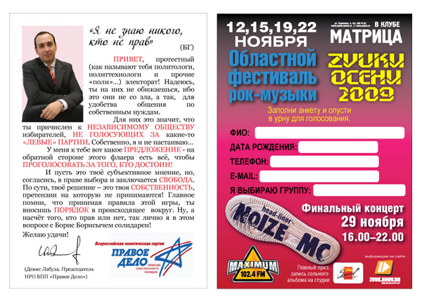 Вчера, 29 ноября, в КРЦ "Матрица" состоялся V областной фестиваль рок-музыки "ZVUKи Осени-2009". Фестиваль организован при содействии НРО партии "Правое дело". Организаторы мероприятия - Internet portal www.zvuk.nnov.ru, студия "NN Sound Production", КРЦ "Матрица", радиостанция "Радио MAXIMUM".