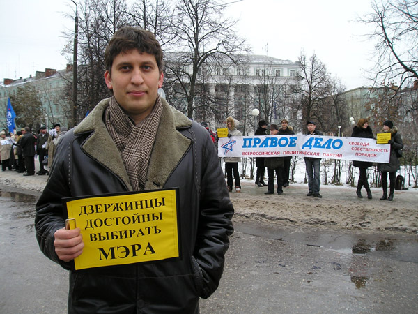 С 12.00 на тротуаре напротив городской Думы был выставлен пикет, организованный Дзержинским отделением партии «Правое дело». В руках пикетчики держали партийную растяжку и лозунги: «Дзержинцы достойны выбирать мэра!», «Всенародные выборы – основа демократии!», «Не трогайте городскую Конституцию!!!». Одновременно рядом стояли пикеты КПРФ - против изменений в устав города – и «Единой России».