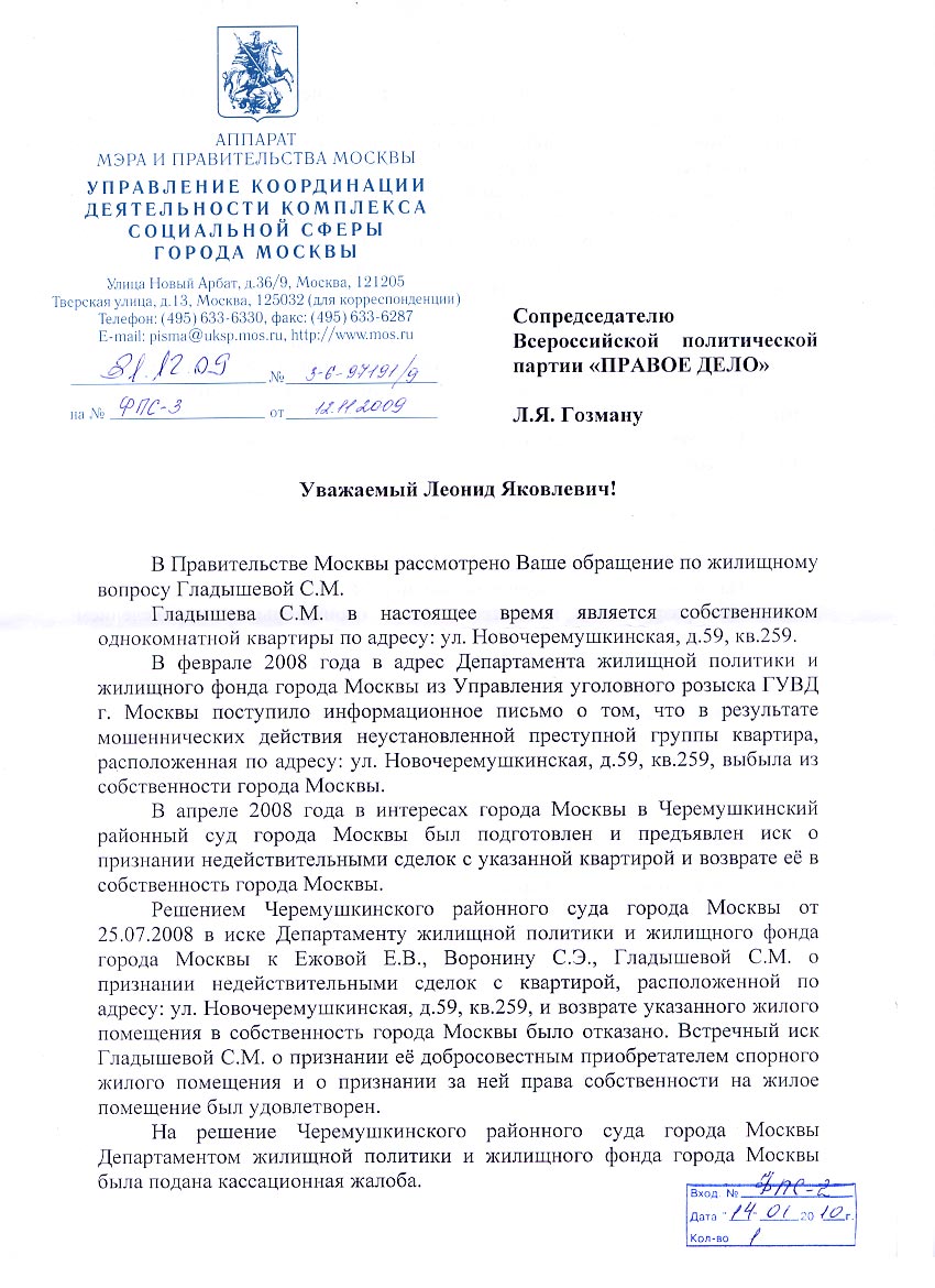 Уважаемый Юрий Михайлович! Правительству г. Москвы потребовалось без малого полгода, чтобы ответить на адресованное Вам обращение Всероссийской политической партии «ПРАВОЕ ДЕЛО». В этом документе речь шла о судьбе москвички С.М.Гладышевой и ее несовершеннолетнего сына, которые из-за произвола чиновников Департамента жилищной политики и Жилищного фонда г.Москвы могут потерять принадлежащую им по праву квартиру. К сожалению, полученный нами ответ (в приложении) предоставляет собой форменную отписку, где подробно расписан судебный процесс по делу Гладышевой, о ходе которого мы прекрасно осведомлены. При этом Вы и Ваши коллеги никак не отреагировали на единственную просьбу, содержащуюся в нашем письме, а именно - отозвать иск. Напоминаем, что мэр Москвы, на котором лежит моральная ответственность за судьбу ребенка и его матери, согласно ГПК РФ имеет право на отзыв соответствующего иска.Получается также, что в Правительстве Москвы даже не замечают перспективу выселения добросовестного покупателя и ребенка из единственной имеющейся у них квартиры, хотя в своих выступлениях Вы постоянно подчеркиваете неустанную заботу о горожанах. Однако, судя по всему, как дело доходит до конкретной ситуации, столичное правительство проявляет полнейшее равнодушие к их проблемам. По этой причине Светлана Гладышева обратилась в партию «ПРАВОЕ ДЕЛО», не надеясь найти справедливость в официальных инстанциях г.Москвы. После выступления партии в поддержку С.М.Гладышевой кандидатам в депутаты Мосгордумы от «ПРАВОГО ДЕЛА» было отказано в регистрации, Вы также подали иск к одному из сопредседателей партии. Возможно, это лишь стечение обстоятельств, хотя мы полагаем, что имеем дело со своеобразной и, к сожалению, предсказуемой реакцией столичных властей на протест общественности против творящихся в Москве безобразий. Тем не менее, несмотря на наши сложные отношения, настоятельно просим Вас, уважаемый Юрий Михайлович, отозвать вышеуказанный иск. Приложение: письмо Управления координации деятельности комплекса социальной сферы г.Москвы Аппарата Мэра и Правительства г.Москвы на имя Л.ГозманаС уважением, сопредседатели партии «Правое дело» Г.Бовт Л.Гозман