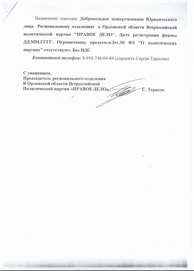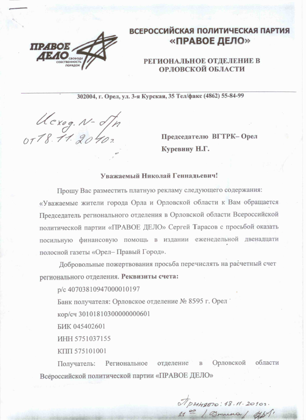 18 ноября 2010 года председатель регионального отделения партии «Правое дело» в Орловской области Сергей Тарасов обратился во Всероссийскую государственную телевизионную и радиовещательную компанию – Орел с письмом, в котором содержалась просьба разместить платную рекламу на канале Россия-1 после окончания новостной программы «Вести-Орел».