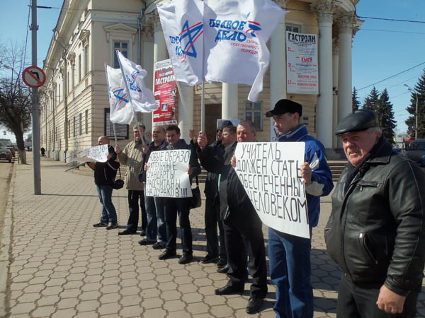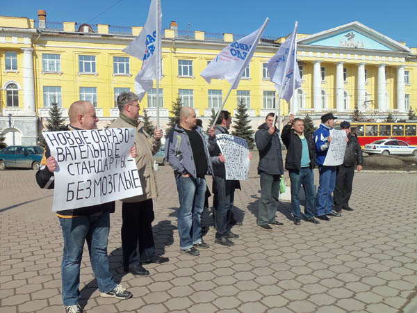 В солнечный полдень у орловского ТЮЗа «Свободное пространство» орловские «правые» начали свою акцию против образовательной реформы. В руках у активистов были плакаты «Новые образовательные стандарты – безмозглые», «Новые образовательные стандарты рассчитаны на дураков» и «Учитель должен стать обеспеченным человеком».