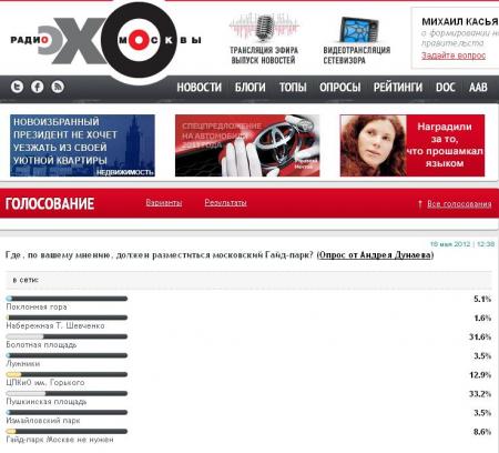 Чуть менее популярным вариантом размещения общественной трибуны стала Болотная площадь (31,6%), а предлагаемая единоросами Поклонная гора, как место для Гайд-парка, оказалась, по мнению посетителей сайта, наименее подходящим для этого местом. Еще 8,6 % считают, что Гайд-парк Москве не нужен.