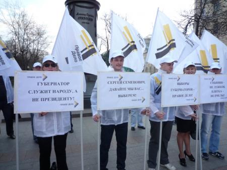 24 апреля политическая партия «ПРАВОЕ ДЕЛО» в ряде российских городов проводит акцию в поддержку прямых губернаторских выборов. Акция приурочена к рассмотрению Госдумой соответствующего закона во втором чтении. Митинги и пикеты проходят в Москве, Санкт-Петербурге, Самарской, Липецкой, Томской, Оренбургской, Пензенской областях. Сотни активистов партии вышли на центральные площади городов, чтобы высказать свое отношению к выборам региональных руководителей своих субъектов.