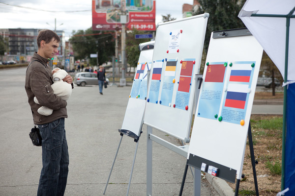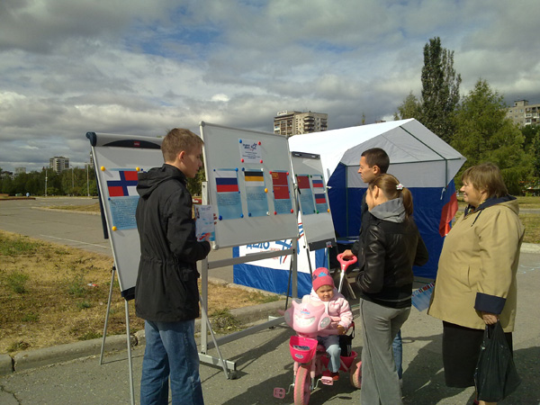 На городской эспланаде была разбита экспозиция, посвященная истории российского флага, консультанты-партийцы отвечали на вопросы посетителей, для всех заинтересованных лиц проводилась мини-экскурсия с рассказом о каждом этапе развития российского флага. Вместе с увлекательным рассказом о флаге каждый посетитель экспозиции получил листовку с занимательными фактами об истории государственных символов страны и памятные сувениры.