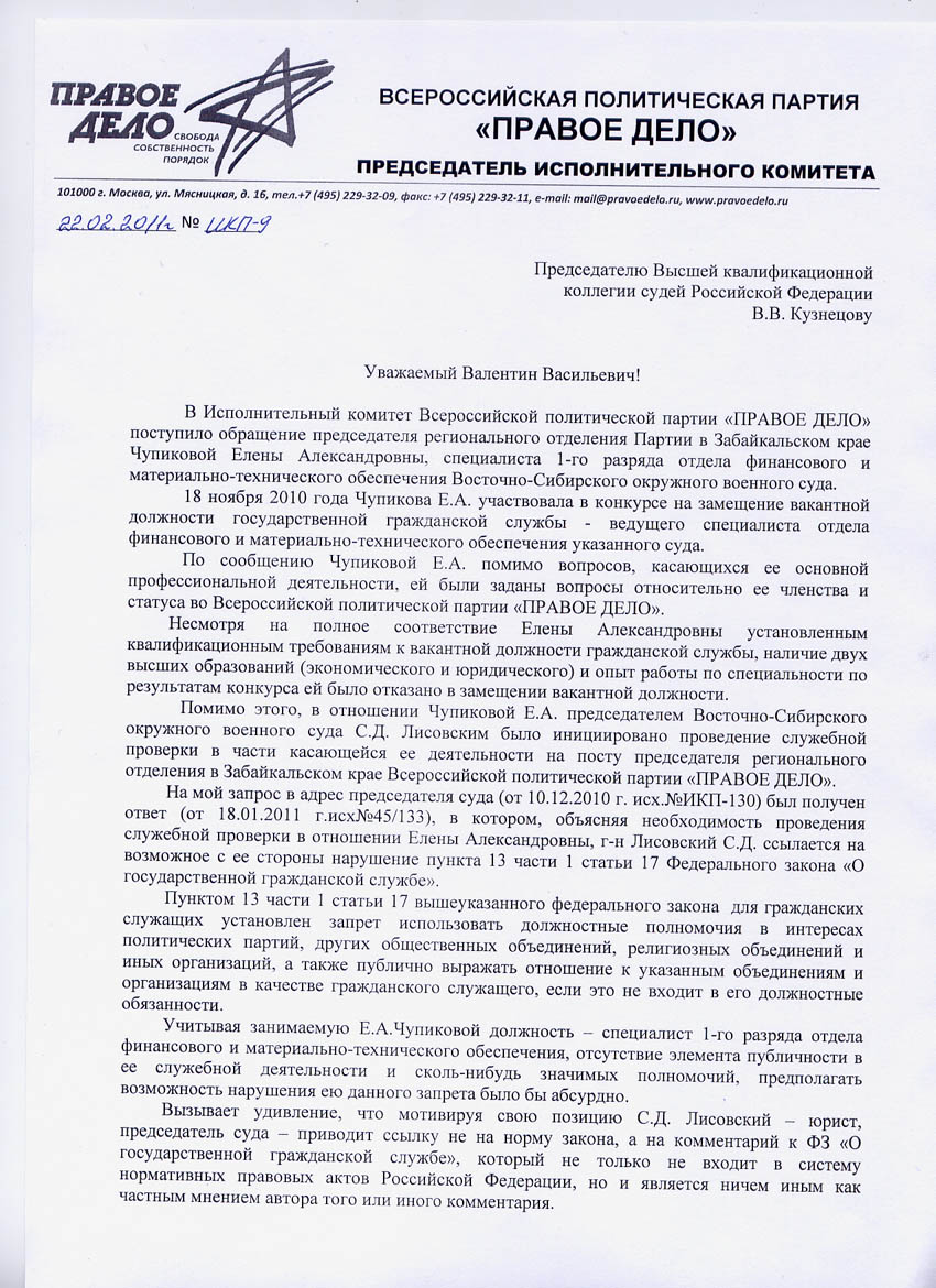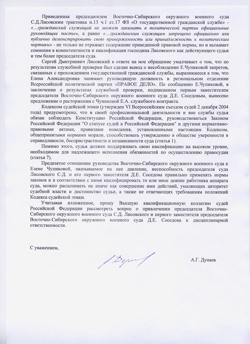 «Предвзятое отношение руководства Восточно-Сибирского окружного военного суда к Елене Чупиковой, оказываемое на нее давление, неспособность председателя суда Лисовского С.Д. и его первого заместителя Д.Е.Соседова правильно применять нормы законов и в соответствии с ними квалифицировать то или иное деяние работника аппарата суда можно расценивать не иначе, как совершение ими действий, умаляющих авторитет судебной власти и достоинство судьи, а также не отвечающих требованиям положений Кодекса судейской этики», - говорится в обращении председателя Исполкома партии «Правое дело» Андрея Дунаева к председателю Высшей квалификационной коллегии судей Российской Федерации В.В.Кузнецову.