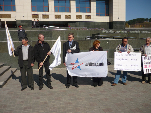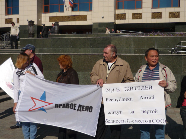 За полчаса до начала мероприятия члены региональных организаций «ПРАВОГО ДЕЛА», КПРФ, «Яблока», ЛДПР, ООО «Центр Андрея Богданова» и представители оппозиционной общественности начали санкционированный пикет у входа в драмтеатр. Участники пикета растянулись в живую цепь вдоль здания драмтеатра. Они держали различные лозунги как относительно социально-экономического положения в Республике Алтай («Республика Алтай – последнее место в Сибири по производству товаров и услуг», «24,4% жителей Республики Алтай живут за чертой бедности», «В Республике Алтай самые низкие детские пособия в СФО. Позор!» «Республика Алтай - лидер в СФО по жилищно-коммунальным платежам», «Достижение правительства Бердникова – самая высокая плата за электроэнергию», « В Республике Алтай самое дорогое отопление в Сибири», «Заслуга правительства Бердникова – голодуют больные дети в детском противотуберкулезном диспансере» и т.п.), так и содержащие призывы и оценки («Долой правительство браконьеров-коррупционеров», «Правительство Бердникова – позор Кремля!», «Правительство Бердникова – в отставку!»). Плакатов и флагов на всех не хватило, поэтому участники пикета, время от времени меняли друг друга.