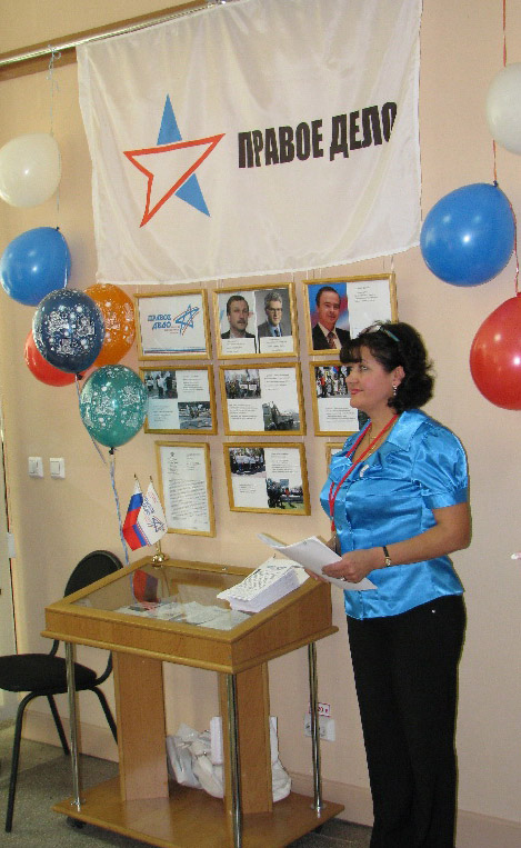 «С момента регистрации «Правого дела» в Республике Хакасия прошел год с небольшим. Члены партии во главе с политическим советом принимают активное участие в общественной жизни региона, выступают против повышения налогов, увеличения тарифов на энергоносители, против строительства кремниевого завода в республике и т.д. Мы добились отмены незаконного установления платы за любительское и спортивное рыболовство, помогаем инвалидам, оказываем бесплатную юридическую помощь членам партии.