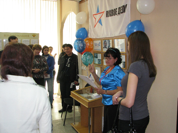 Все это можно увидеть на фотографиях и прочитать комментариях к ним. В нашей партии объединились представители малого и среднего бизнеса, который реально дает рабочие места, зарабатывает сам и платит налоги. Поэтому мы будем защищать и отстаивать его права и интересы», - отметила Галина Горчакова. - А для повышения политической грамотности молодежи мы разработали анкету, заполнив которую, студент получит приз в виде карманного календаря с нашим логотипом. Буклет с полной информацией о нашей партии может взять с собой любой посетитель выставки».