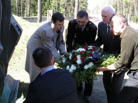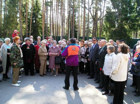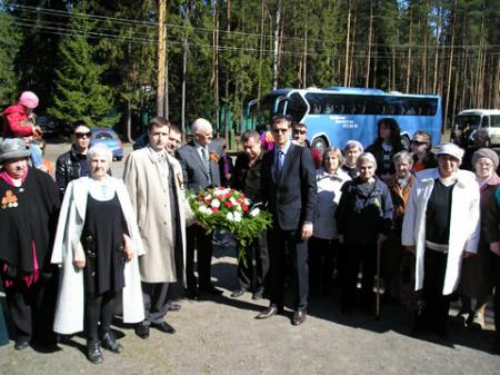 Более 80 ветеранов войны и членов партии на двух автобусах приехали к мемориальному кладбищу, где была проведена экскурсия и предоставлено время самостоятельно осмотреть места захоронения невинных жертв. 50% участников мероприятия, прожив в городе Ленинграде - Санкт-Петербурге, почти всю жизнь, никогда здесь не были, хотя расположено кладбище всего в 25 мин. езды от станции метро "проспект Просвещения".