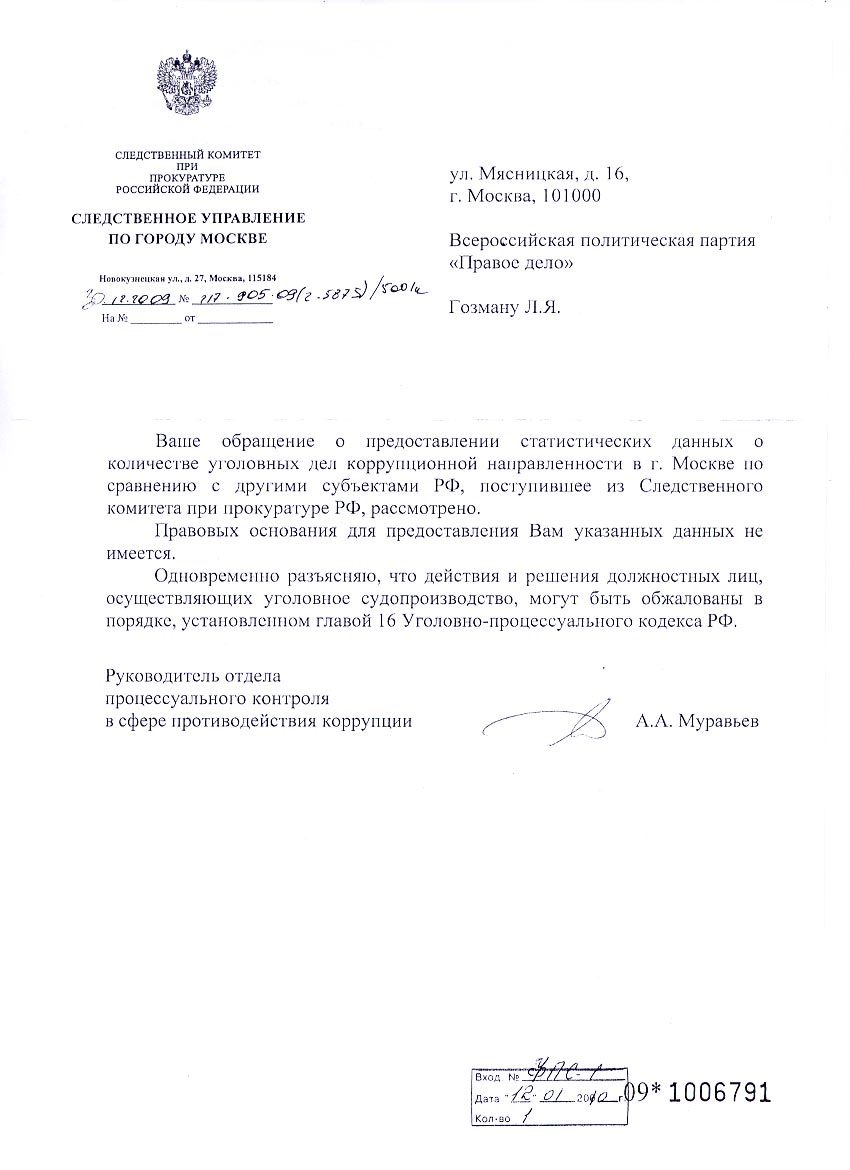Сегодня в партию «ПРАВОЕ ДЕЛО» поступил ответ на соответствующий запрос сопредседателя партии Л.Гозмана на имя Генерального прокурора, в котором Следственное управление по городу Москвеотказалось предоставить данные о коррупции в Москве. Отписка выражена одной фразой: «Правовых оснований для предоставления Вам указанных данных не имеется».