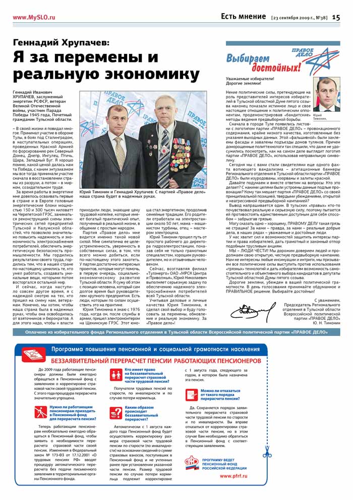 Учитывая деловые и личные качества Юрия Тимонина, я сделал свой выбор и буду голосовать за перемены, обновление и реальную экономику. За «Правое дело»!