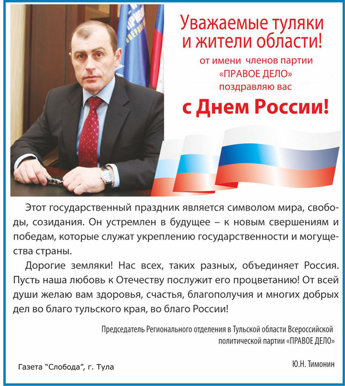 Тульская область: Юрий Тимонин со страниц издания "Слобода" поздравил земляков с Днем России