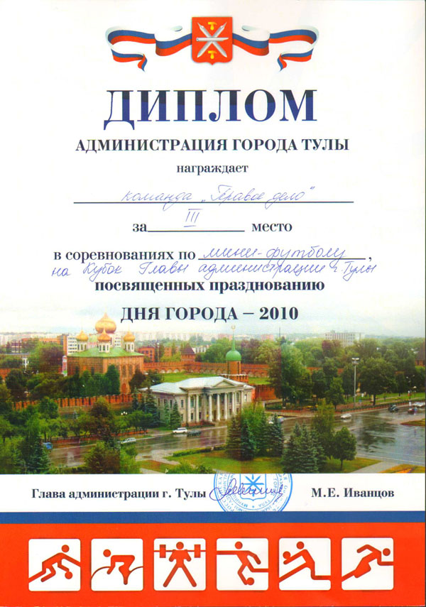 Команда Тульского регионального отделения партии «Правое дело» заняла третье место в турнире по мини-футболу на кубок главы администрации Тулы. Турнир прошел в преддверии Дня города на стадионе футбольного клуба «Арсенал». Лучшим вратарем по результатам соревнований признан член партии «Правое дело» Олег Лещенко.