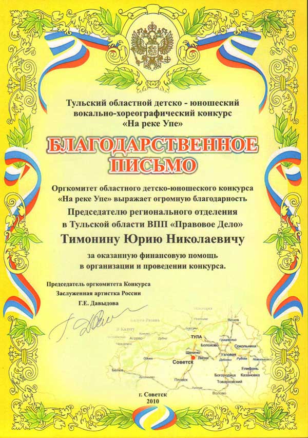 В адрес председателя регионального отделения в Тульской области Всероссийской политической партии «ПРАВОЕ ДЕЛО» Юрия Тимонина поступила благодарность от председателя организационного комитета областного детско-юношеского вокально-хореографического конкурса «На реке Упе», заслуженной артистки России Галины Давыдовой за поддержку и финансовую помощь в деле проведения мероприятия.