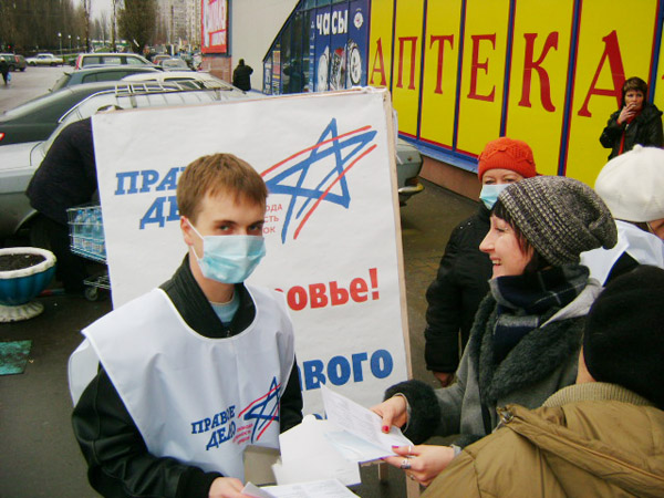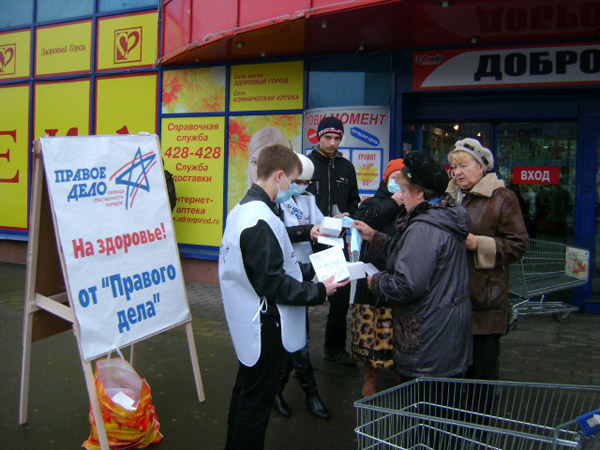 Активисты партии раздавали горожанам маски и брошюры «Как отличить ОРВИ от гриппа»