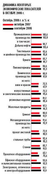 Если резкое падение уже в октябре (см. график на стр. 34) химического и металлургического производства, выпуска пиломатериалов безусловно связано в первую очередь с ухудшившейся мировой конъюнктурой, то снижение производства в отраслях, ориентированных почти исключительно на внутренний спрос, таких как машиностроение, легкая и пищевая промышленность, явно говорит об углублении кризиса.