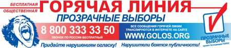 Ассоциация открывает горячую линию о нарушениях на выборах Общественное объединение «Голос» открывает горячую линию о нарушениях на выборах, сообщают на сайте организации. Данная общественная линия позволяет оперативно сообщить о любом нарушении на выборах и оперативно придать их огласке. Звонок на горячую линию по номеру 8 800 333 333 50 из любой части России бесплатный. Об этом сообщается на сайте организации. Для того чтобы журналисты могли оперативно узнавать информацию обо всех нарушениях, в день региональных выборов с полудня и до полуночи в режиме нон-стоп будет работать пресс-центр. Кроме того, как сообщает пресс-служба «Голоса», в течении работы пресс-центра журналисты смогут ознакомиться со всей информацией о выборах, получать информацию с горячей линии в режиме on-line. В течение работы Пресс-центра о ходе избирательной кампании расскажут эксперты, социологи, политологи, наблюдатели и другие участники избирательного процесса.
