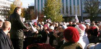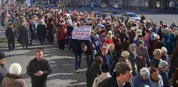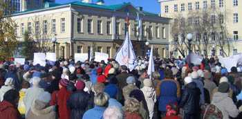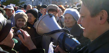 Под окнами губернаторского дворца собравшиеся организованно продолжили митинг: "Путинский план залез нам в карман! ", "Бабушкам и дедушкам опять не хватит хлебушка! ", "Эй, правительство! Кончай грабительство! ", "Россель, проснись! ". Одна женщина из числа митингующих даже прочитала частушки собственного сочинения: