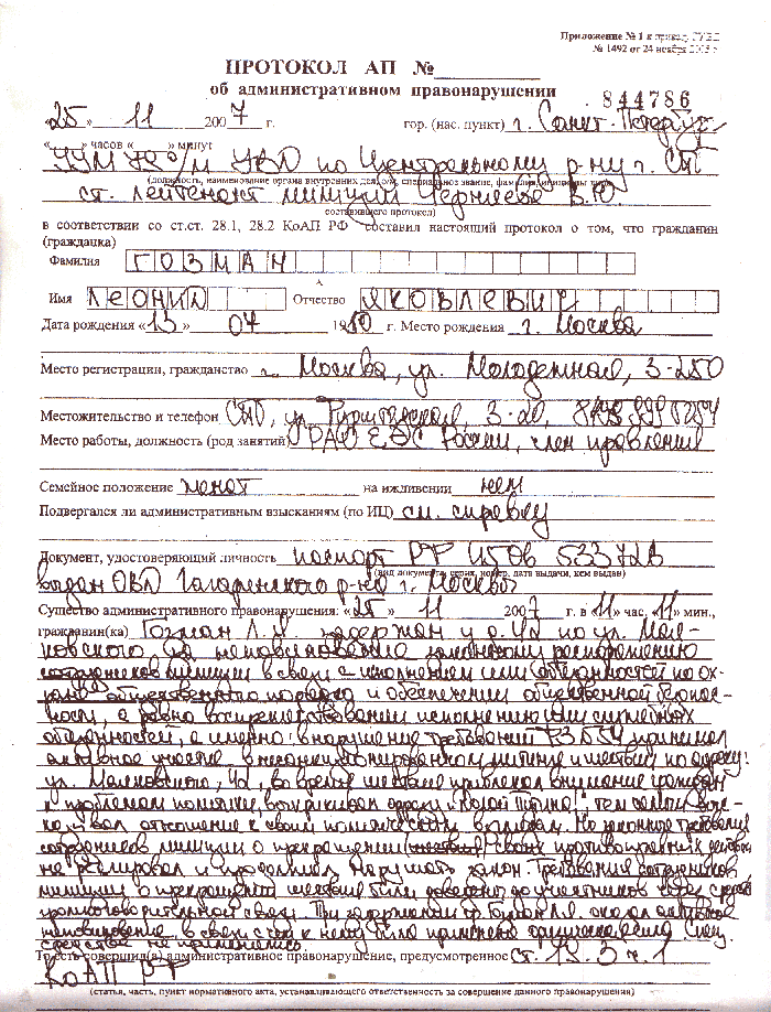Требования сотрудников милиции о прекращении шествия были доведены до участников через средства громкоговорящей связи. Гозман Л.Я. оказал активное неповиновение, в связи с чем к нему была применена физическая сила. Специальные средства не применялись»