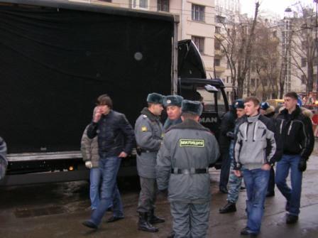 Подойдя к организаторам митинга, я рассказал им о случившемся и посетовал на плохое самочувствие. Не успели мы дослушать очередного оратора, как рев глушилок возобновился. Мне стало ясно, что ноутбук хулиганам возвратили. Я подошел к другому полковнику, который, как мне показалось, командовал всеми, представился ему и попросил обеспечить конституционное право граждан на законное проведение митинга и пресечь хулиганские действия подчиненных некоего Владислава. «Хорошо, сейчас примем меры» - был ответ полковника. Я вновь отправился к глушилкам. Вновь проходя через заград-отряд из ОМОНа, я наблюдал как генерал морщась от невыносимого звука отчитывал омоновского полковника, чтобы тот не лез куда не надо, а всяких правозащитников гнал в шею. Около глушилок стояли три сержанта милиции и старший лейтенант ОМОНа, постоянно разговаривавший по рации. Лейтенант заявил мне, что вмешиваться ни во что не может, так как всего навсего обеспечивает связь. Правда не понятно кого и с кем.