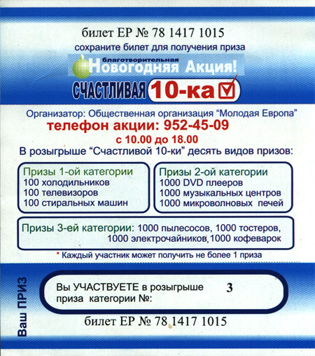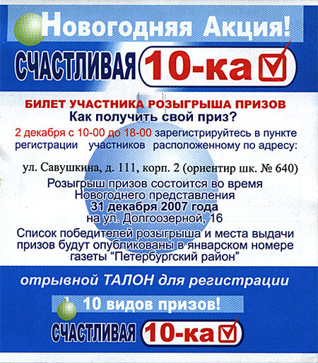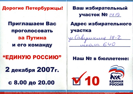 27 ноября 2007 года в почтовых ящиках домов, расположенных на участке № 1419, избиратели обнаружили одновременно буклет «Единой России» и конверт с логотипом благотворительной новогодней акции «Счастливая 10-ка». Буклет представлял из себя обращение к избирателям, с предложением проголосовать «За Путина и его команду «Единую Россию» на избирательном участке № 1419 по адресу: ул. Савушкина, 111-2. В конверте находился билет для участия в розыгрыше «Счастливая 10-ка» с отрывным талоном для регистрации участников по адресу, который полностью совпадает с адресом помещения для голосования - ул. Савушкина, 111-2. В билете указаны призы для участников: холодильники, телевизоры, стиральные машины (по 100 единиц каждого наименования), плееры, музыкальные центры, микроволновые печи (по 1000 единиц) и так далее. Количество призов позволяет судить о массовом характере проводимой акции. Организатором розыгрыша является общественная организация «Молодая Европа». Дата регистрации обозначена как 02.12.07, то есть день выборов. В обоих приглашениях присутствует характерное изображение «галочки» в квадрате напротив цифры «10», что является недвусмысленной подсказкой, как должен проголосовать избиратель.