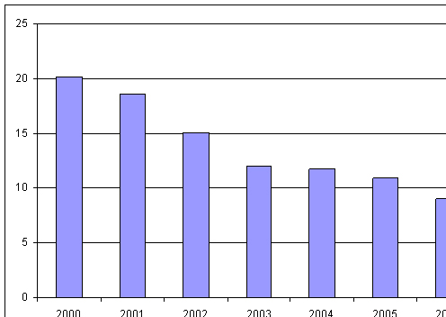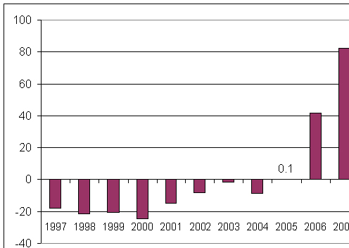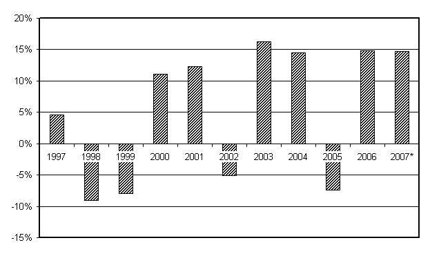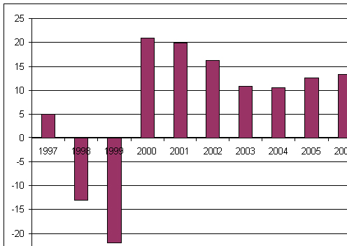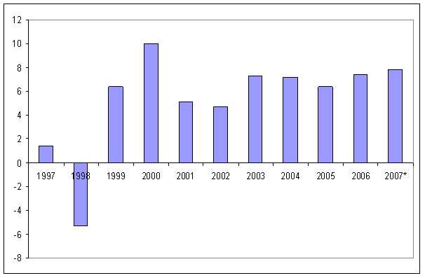 Экономический рост в России начался в 1997 году после преодоления постсоциалистической рецессии, связанной с крахом советской экономики, перестройкой важнейших экономических институтов. В 1998 году он был прерван резким ухудшением мировой экономической конъюнктуры, оттоком капитала с многих развивающихся рынков (включая российский), падением цен на нефть (в реальном исчислении) до беспрецедентно низкого за последние 30 лет уровня. Рост восстановился в 1999 году и с тех пор продолжается уже 9 лет. Его средние темпы за этот период – 6,9% в год (см. рис. 1).