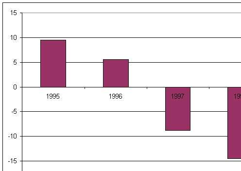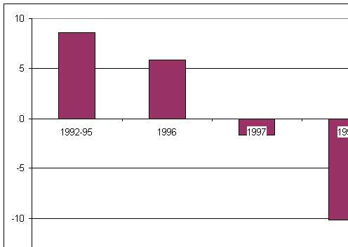 Влияние оттока капитала на национальные экономики может быть более сильным, чем на мир в целом. В 1996 году Таиланд справедливо считали одной из наиболее динамично развивающихся стран. Никто не предполагал, что на протяжении короткого времени изменение потока капитала может сравняться с четвертью ВВП страны (см. рис. 9). Это радикально изменило условия проводимой политики. Таиланд, власти которого привыкли к характерному для первой половины 1990-х годов динамичному экономическому росту, вынужден был адаптироваться к резкому сокращению объемов экономической деятельности (см. рис. 10).
